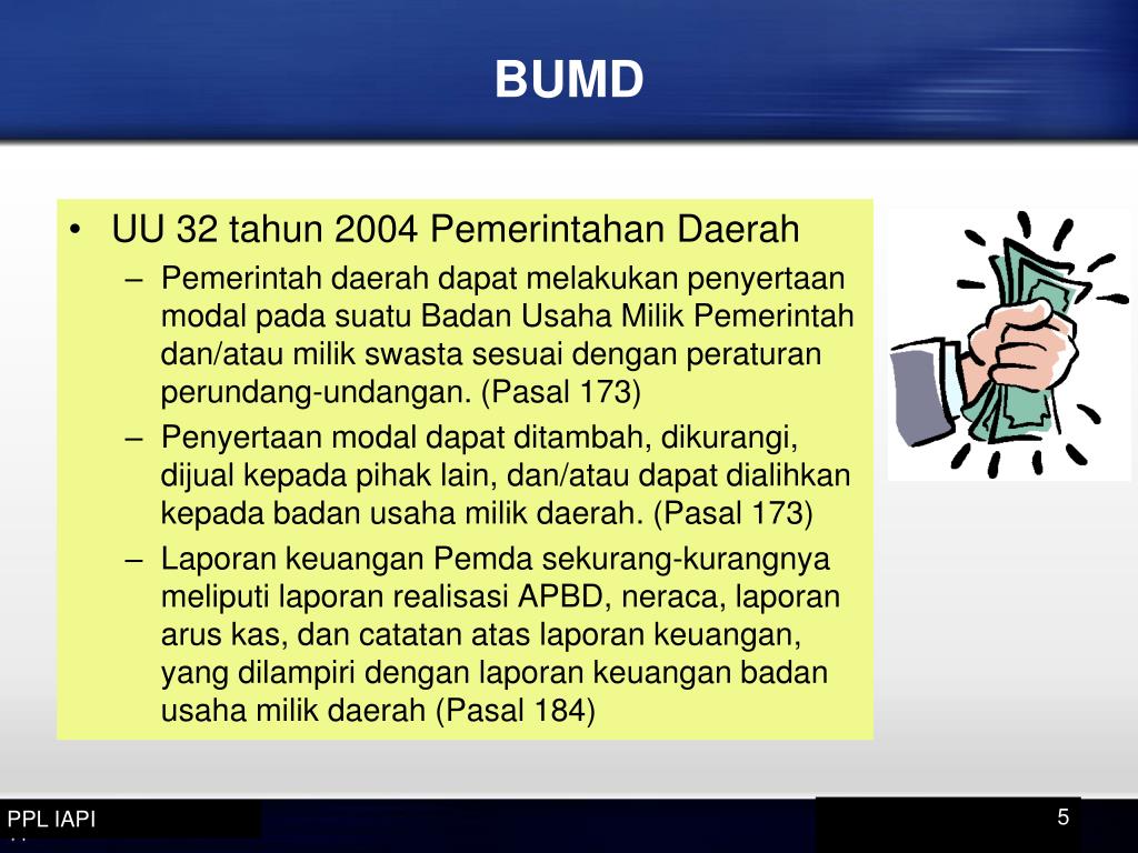 BUMD • UU 32 tahun 2004 Pemerintahan Daerah • Pemerintah daerah dapat melakukan penyertaan modal pada suatu Badan Usaha Milik Pemerintah dan/atau milik swasta sesuai dengan peraturan perundang-undangan. (Pasal 173) • Penyertaan modal dapat ditambah, dikurangi, dijual kepada pihak lain, dan/atau dapat dialihkan kepada badan usaha milik daerah. (Pasal 173) • Laporan keuangan Pemda sekurang-kurangnya meliputi laporan realisasi APBD, neraca, laporan arus kas, dan catatan atas laporan keuangan, yang dilampiri dengan laporan keuangan badan usaha milik daerah (Pasal 184)