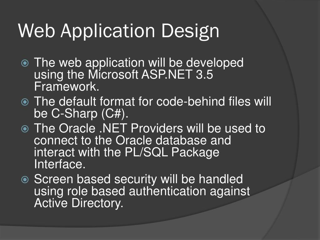 Web Application Design • The web application will be developed using the Microsoft ASP.NET 3.5 Framework. • The default format for code-behind files will be C-Sharp (C#). • The Oracle .NET Providers will be used to connect to the Oracle database and interact with the PL/SQL Package Interface. • Screen based security will be handled using role based authentication against Active Directory.