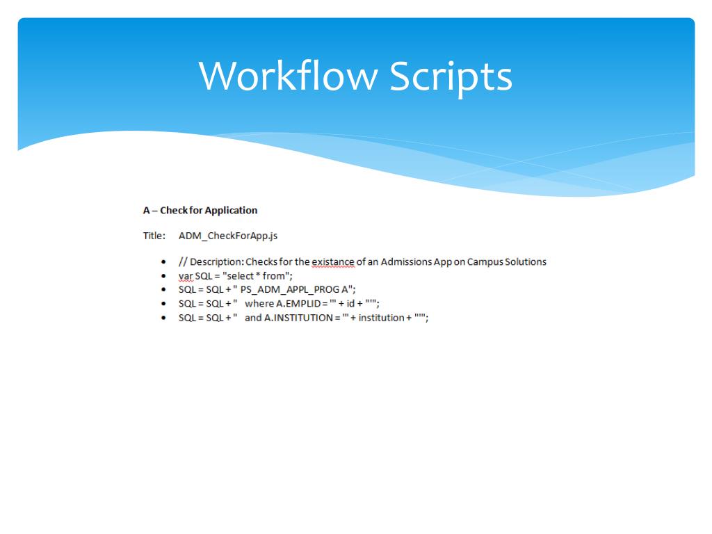 Current Workflows • High School Transcript • College Transcript • Military Transcripts • Miscellaneous Documents • Application Signature • Criminal History • Midterm Grades • Application Fee Waiver request • GRE test scores • GMAT test scores • Tuition Classification Form • Major Response Form
