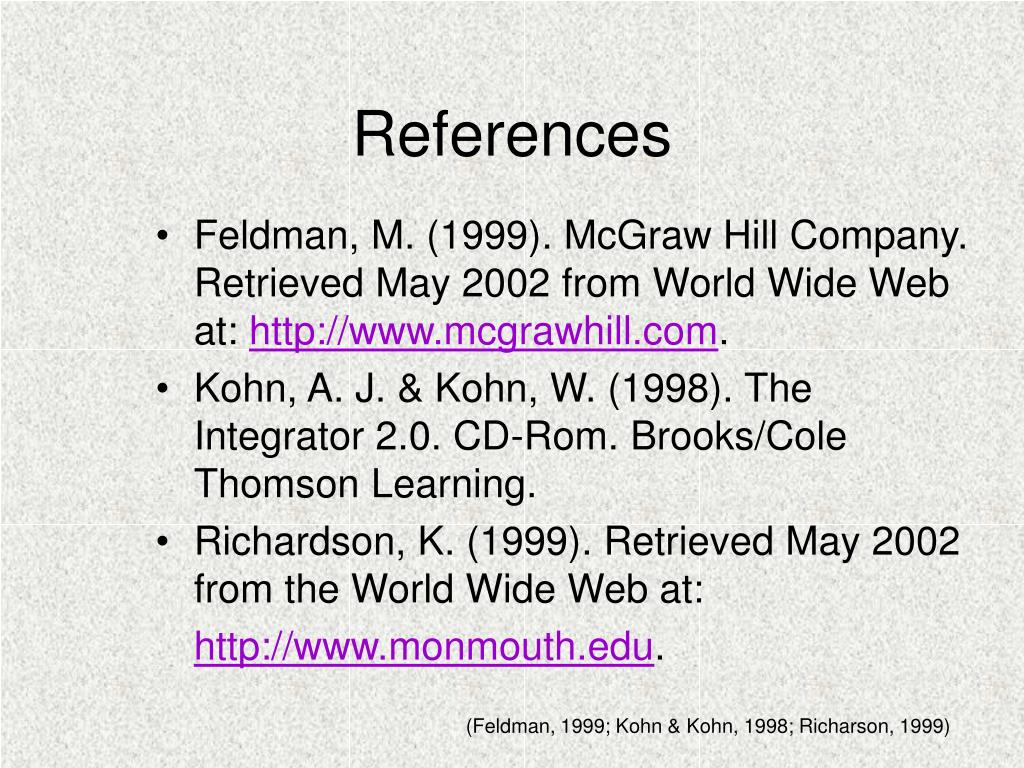 References • Feldman, M. (1999). McGraw Hill Company. Retrieved May 2002 from World Wide Web at: http://www.mcgrawhill.com. • Kohn, A. J. & Kohn, W. (1998). The Integrator 2.0. CD-Rom. Brooks/Cole Thomson Learning. • Richardson, K. (1999). Retrieved May 2002 from the World Wide Web at: http://www.monmouth.edu. (Feldman, 1999; Kohn & Kohn, 1998; Richarson, 1999)