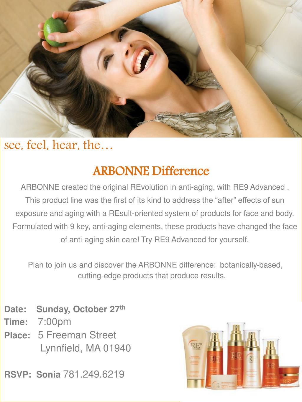 see, feel, hear, the… ARBONNE Difference ARBONNE created the original REvolution in anti-aging, with RE9 Advanced . This product line was the first of its kind to address the “after” effects of sun exposure and aging with a REsult-oriented system of products for face and body. Formulated with 9 key, anti-aging elements, these products have changed the face of anti-aging skin care! Try RE9 Advanced for yourself. Plan to join us and discover the ARBONNE difference: botanically-based, cutting-edge products that produce results. Date: Sunday, October 27th Time: 7:00pm Place: 5 Freeman Street Lynnfield, MA 01940 RSVP: Sonia 781.249.6219