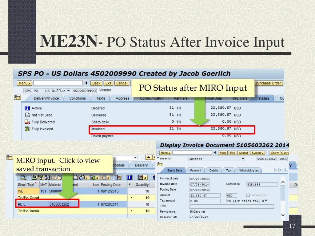 ME23N- PO Status After Invoice Input PO Status after MIRO Input MIRO input. Click to view saved transaction.