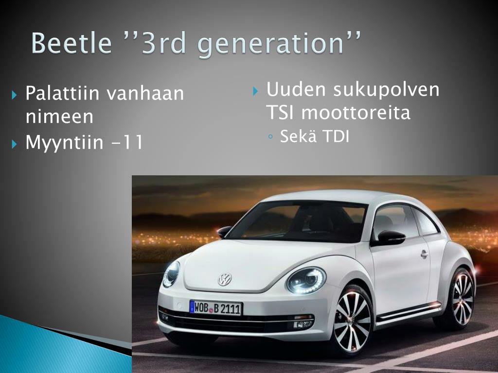 Beetle ’’3rd generation’’ • Uuden sukupolven TSI moottoreita • Sekä TDI • Palattiin vanhaan nimeen • Myyntiin -11