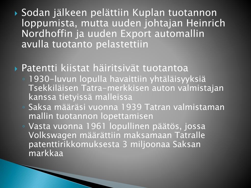 Sodan jälkeen pelättiin Kuplan tuotannon loppumista, mutta uuden johtajan Heinrich Nordhoffin ja uuden Export automallin avulla tuotanto pelastettiin • Patentti kiistat häiritsivät tuotantoa • 1930-luvun lopulla havaittiin yhtäläisyyksiä Tsekkiläisen Tatra-merkkisen auton valmistajan kanssa tietyissä malleissa • Saksa määräsi vuonna 1939 Tatran valmistaman mallin tuotannon lopettamisen • Vasta vuonna 1961 lopullinen päätös, jossa Volkswagen määrättiin maksamaan Tatralle patenttirikkomuksesta 3 miljoonaa Saksan markkaa