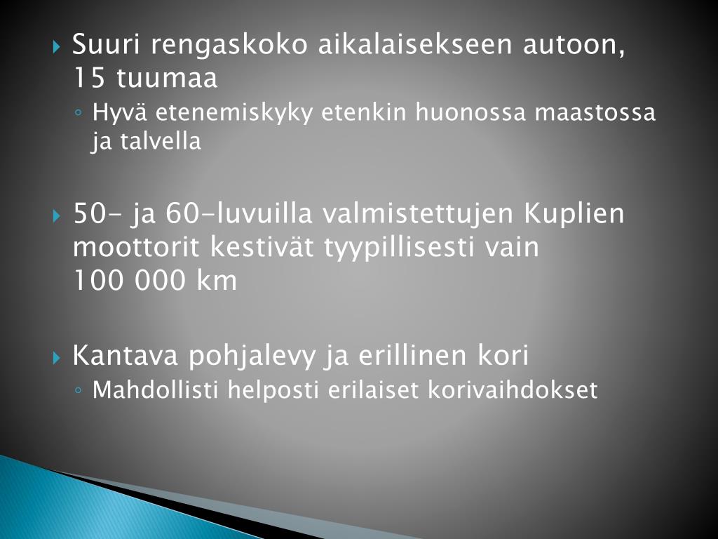 Suuri rengaskoko aikalaisekseen autoon, 15 tuumaa • Hyvä etenemiskyky etenkin huonossa maastossa ja talvella • 50- ja 60-luvuilla valmistettujen Kuplien moottorit kestivät tyypillisesti vain 100 000 km • Kantava pohjalevy ja erillinen kori • Mahdollisti helposti erilaiset korivaihdokset