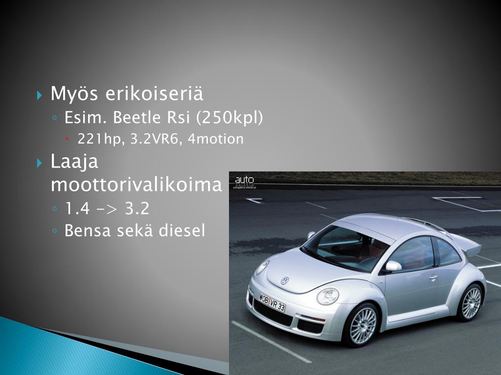 Myös erikoiseriä • Esim. Beetle Rsi (250kpl) • 221hp, 3.2VR6, 4motion • Laaja moottorivalikoima • 1.4 -> 3.2 • Bensa sekä diesel