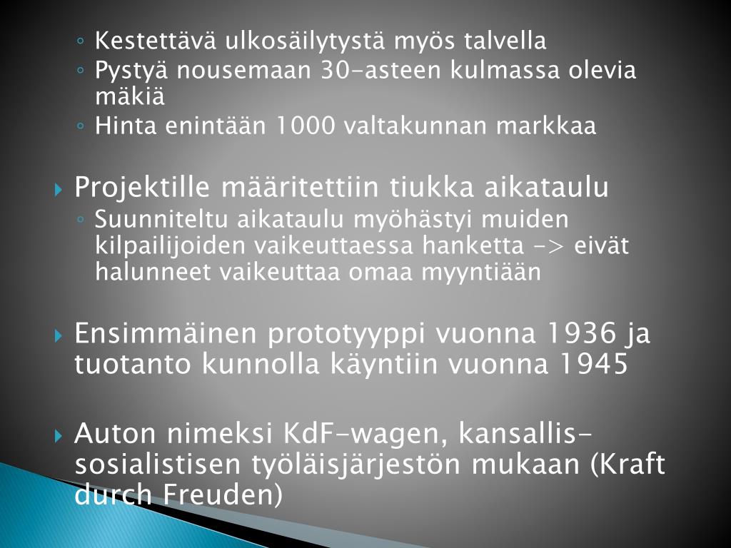 Kestettävä ulkosäilytystä myös talvella • Pystyä nousemaan 30-asteen kulmassa olevia mäkiä • Hinta enintään 1000 valtakunnan markkaa • Projektille määritettiin tiukka aikataulu • Suunniteltu aikataulu myöhästyi muiden kilpailijoiden vaikeuttaessa hanketta -> eivät halunneet vaikeuttaa omaa myyntiään • Ensimmäinen prototyyppi vuonna 1936 ja tuotanto kunnolla käyntiin vuonna 1945 • Auton nimeksi KdF-wagen, kansallis- sosialistisen työläisjärjestön mukaan (KraftdurchFreuden)