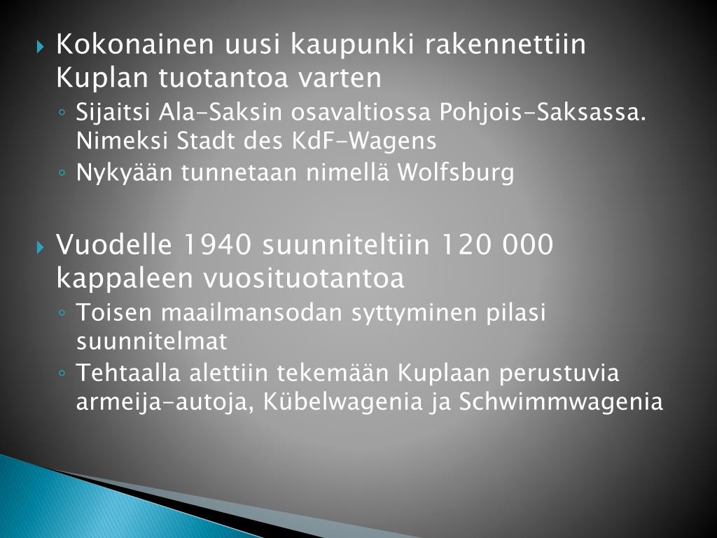 Kokonainen uusi kaupunki rakennettiin Kuplan tuotantoa varten • Sijaitsi Ala-Saksin osavaltiossa Pohjois-Saksassa. Nimeksi Stadt des KdF-Wagens • Nykyään tunnetaan nimellä Wolfsburg • Vuodelle 1940 suunniteltiin 120 000 kappaleen vuosituotantoa • Toisen maailmansodan syttyminen pilasi suunnitelmat • Tehtaalla alettiin tekemään Kuplaan perustuvia armeija-autoja, Kübelwagenia ja Schwimmwagenia