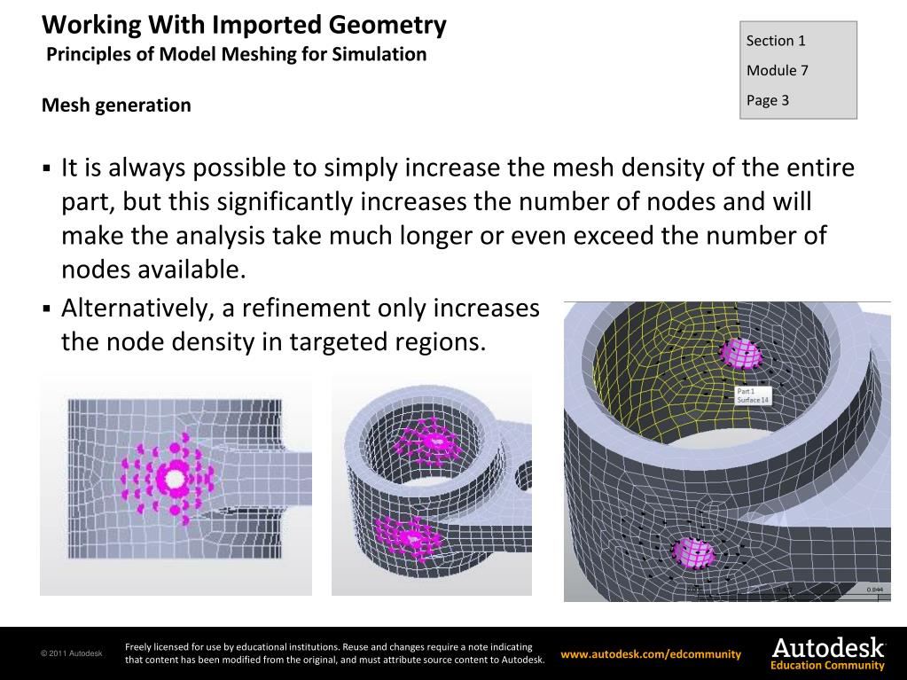 Section 1 Module 7 Page 3 Working With Imported Geometry Principles of Model Meshing for Simulation Mesh generation • It is always possible to simply increase the mesh density of the entire part, but this significantly increases the number of nodes and will make the analysis take much longer or even exceed the number of nodes available. • Alternatively, a refinement only increasesthe node density in targeted regions.