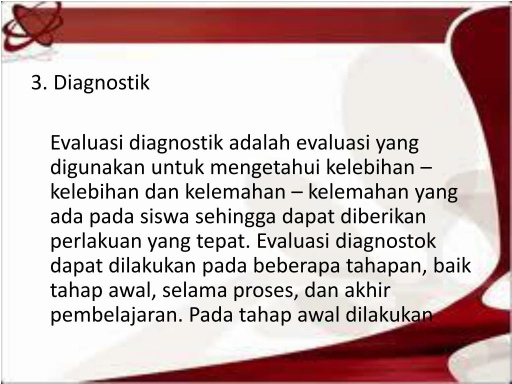 3. Diagnostik Evaluasidiagnostikadalahevaluasi yang digunakanuntukmengetahuikelebihan – kelebihandankelemahan – kelemahan yang adapadasiswasehinggadapatdiberikanperlakuan yang tepat. Evaluasidiagnostokdapatdilakukanpadabeberapatahapan, baiktahapawal, selamaproses, danakhirpembelajaran. Padatahapawaldilakukan