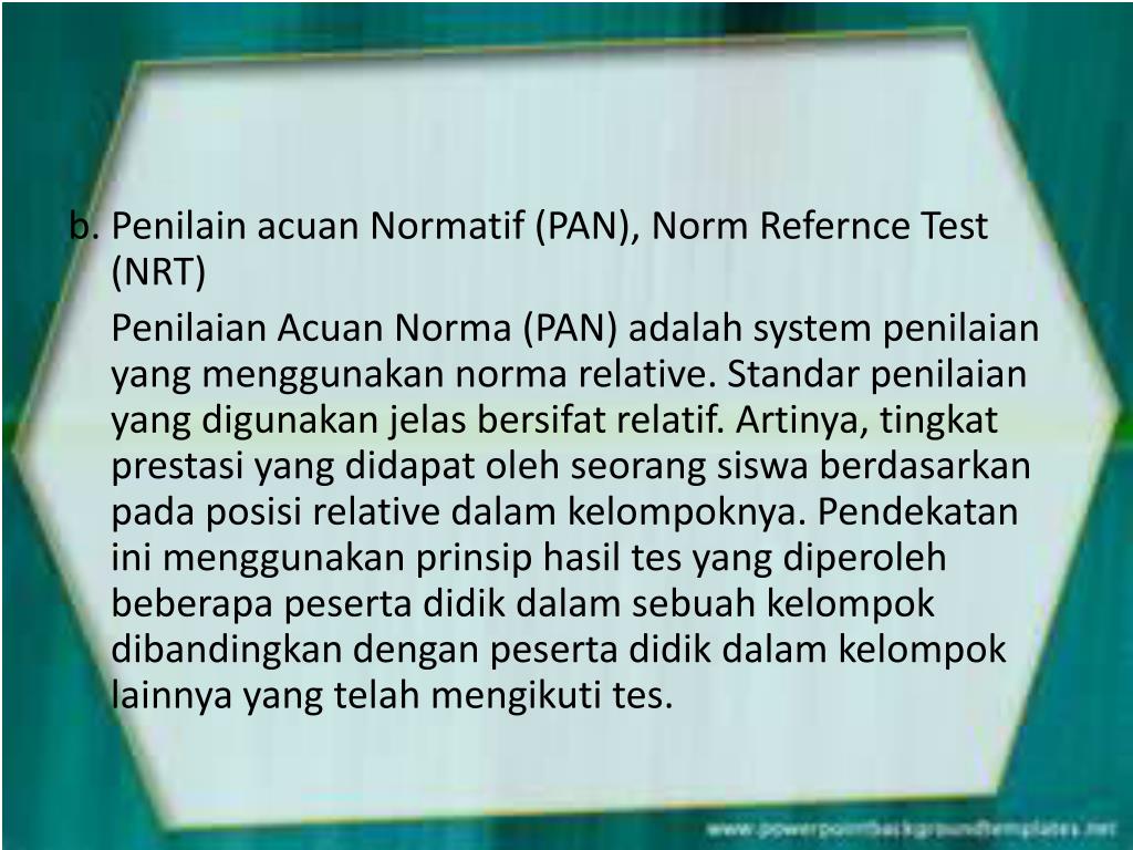 b. PenilainacuanNormatif (PAN), Norm Refernce Test (NRT) PenilaianAcuan Norma (PAN) adalah system penilaian yang menggunakannorma relative. Standarpenilaian yang digunakanjelasbersifatrelatif. Artinya, tingkatprestasi yang didapatolehseorangsiswaberdasarkanpadaposisi relative dalamkelompoknya. Pendekataninimenggunakanprinsiphasiltes yang diperolehbeberapapesertadidikdalamsebuahkelompokdibandingkandenganpesertadidikdalamkelompoklainnya yang telahmengikutites.