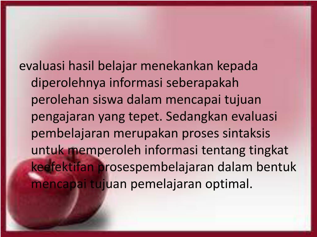 evaluasi hasil belajar menekankan kepada diperolehnya informasi seberapakah perolehan siswa dalam mencapai tujuan pengajaran yang tepet. Sedangkan evaluasi pembelajaran merupakan proses sintaksis untuk memperoleh informasi tentang tingkat keefektifan prosespembelajaran dalam bentuk mencapai tujuan pemelajaran optimal.
