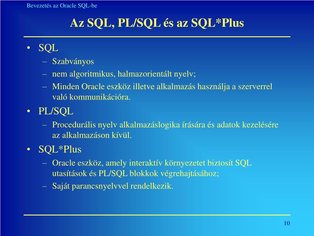 Az SQL, PL/SQL és az SQL*Plus • SQL • Szabványos • nem algoritmikus, halmazorientált nyelv; • Minden Oracle eszköz illetve alkalmazás használja a szerverrel való kommunikációra. • PL/SQL • Procedurális nyelv alkalmazáslogika írására és adatok kezelésére az alkalmazáson kívül. • SQL*Plus • Oracle eszköz, amely interaktív környezetet biztosít SQL utasítások és PL/SQL blokkok végrehajtásához; • Saját parancsnyelvvel rendelkezik.