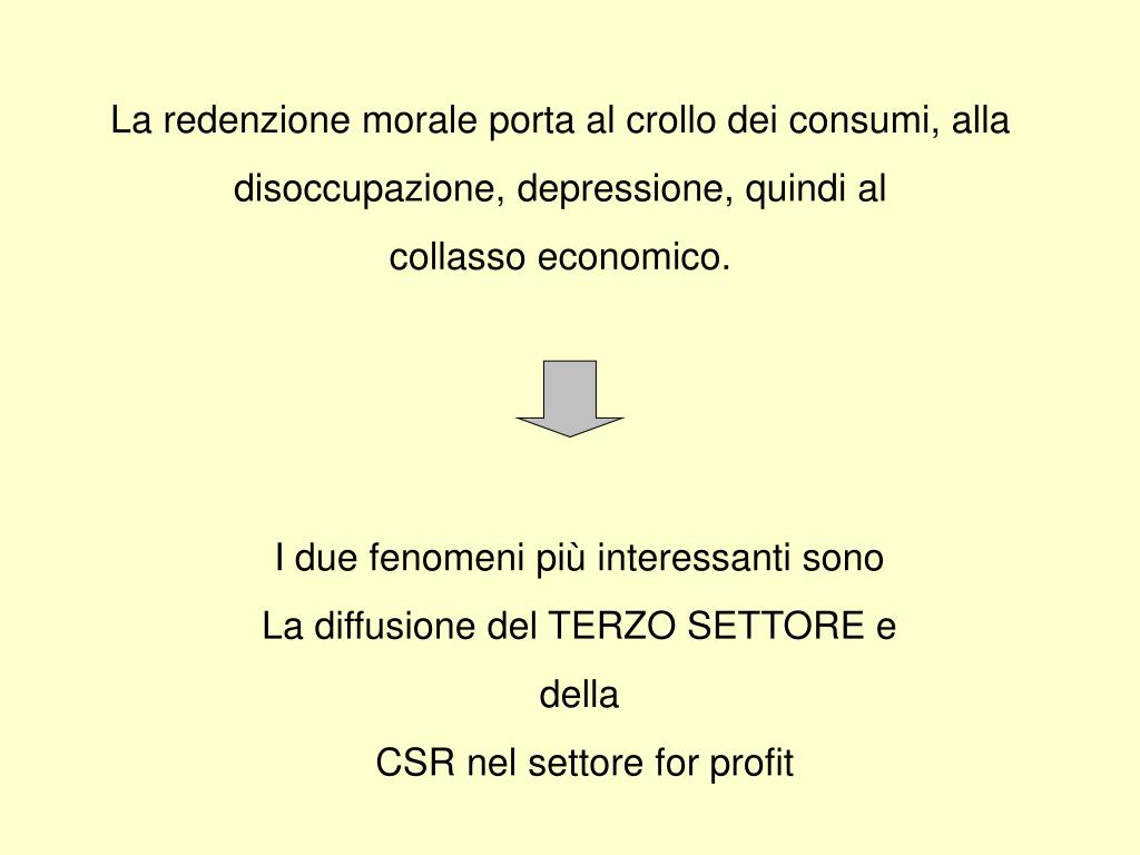 La redenzione morale porta al crollo dei consumi, alla disoccupazione, depressione, quindi alcollasso economico. I due fenomeni più interessanti sono La diffusione del TERZO SETTORE e della CSR nel settore for profit