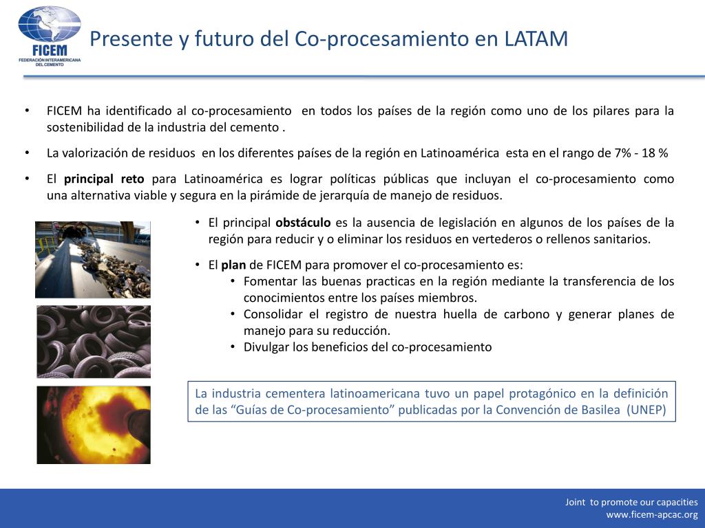 Presente y futuro del Co-procesamiento en LATAM • FICEM ha identificado al co-procesamiento en todos los países de la región como uno de los pilares para la sostenibilidad de la industria del cemento . • La valorización de residuos en los diferentes países de la región en Latinoamérica esta en el rango de 7% - 18 % • El principal reto para Latinoamérica es lograr políticas públicas que incluyan el co-procesamiento como una alternativa viable y segura en la pirámide de jerarquía de manejo de residuos. • El principal obstáculo es la ausencia de legislación en algunos de los países de la región para reducir y o eliminar los residuos en vertederos o rellenos sanitarios. • El plan de FICEM para promover el co-procesamiento es: • Fomentar las buenas practicas en la región mediante la transferencia de los conocimientos entre los países miembros. • Consolidar el registro de nuestra huella de carbono y generar planes de manejo para su reducción. • Divulgar los beneficios del co-procesamiento La industria cementera latinoamericana tuvo un papel protagónico en la definición de las “Guías de Co-procesamiento” publicadas por la Convención de Basilea (UNEP)
