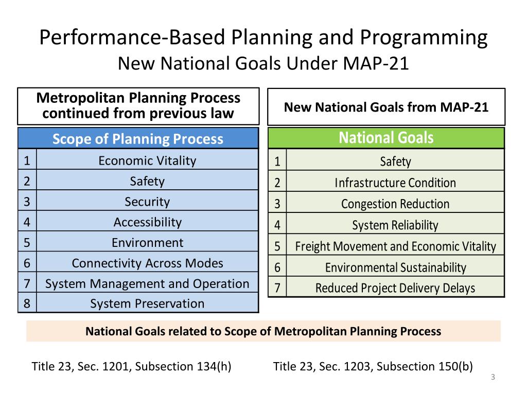 Performance-Based Planning and ProgrammingNew National Goals Under MAP-21 Metropolitan Planning Process continued from previous law New National Goals from MAP-21 National Goals related to Scope of Metropolitan Planning Process Title 23, Sec. 1201, Subsection 134(h) Title 23, Sec. 1203, Subsection 150(b)