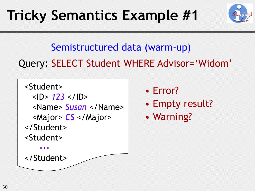 Tricky Semantics Example #1 • Semistructured data (warm-up) • Query:SELECT Student WHERE Advisor=‘Widom’ <Student> <ID> 123 </ID> <Name> Susan </Name> <Major> CS </Major> </Student> <Student> ● ● ● </Student> • Lore • Empty result • Warning