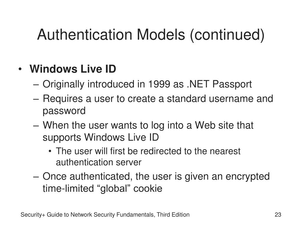 Authentication Models (continued) • Windows Live ID • Originally introduced in 1999 as .NET Passport • Requires a user to create a standard username and password • When the user wants to log into a Web site that supports Windows Live ID • The user will first be redirected to the nearest authentication server • Once authenticated, the user is given an encrypted time-limited “global” cookie Security+ Guide to Network Security Fundamentals, Third Edition