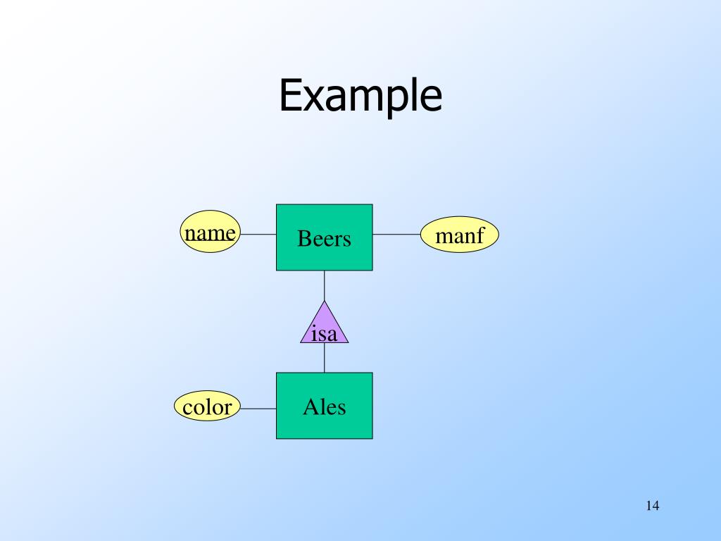 E/R Style name manf Bud Anheuser-Busch Summerbrew Pete’s Beers name color Summerbrew dark Ales Good for queries like “find all beers (including ales) made by Pete’s.”