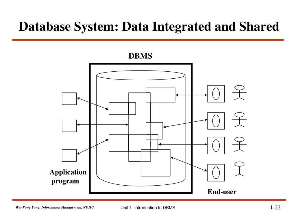 DBMS Application program End-user Database System: Data Integrated and Shared