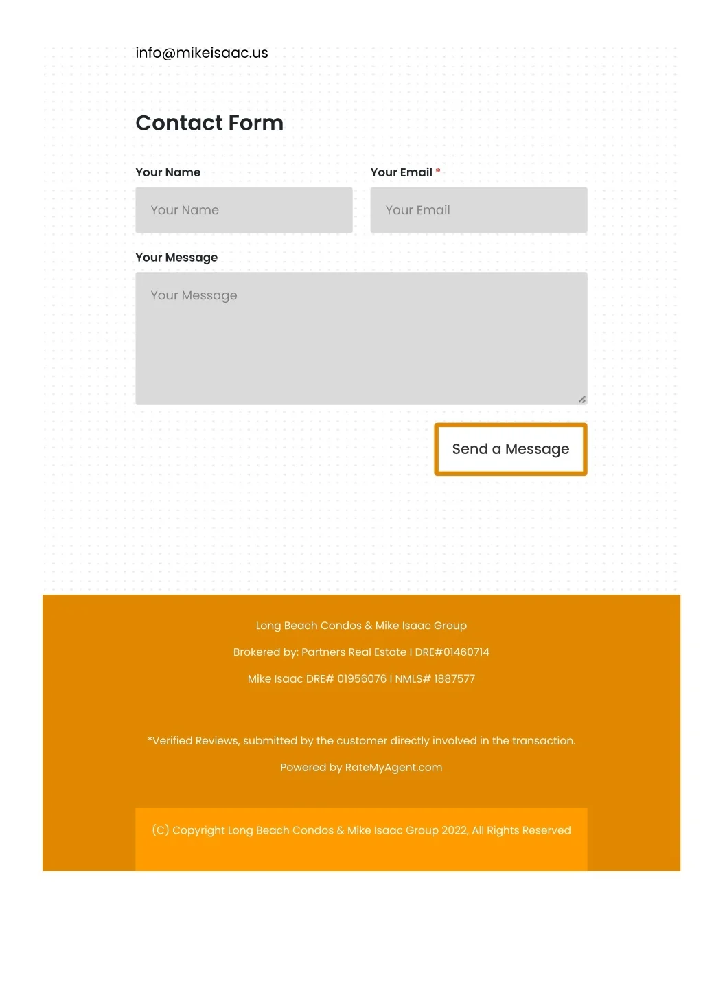 info@mikeisaac.us Contact Form Your Name Your Email * Your Name Your Email Your Message Your Message Send a Message Long Beach Condos & Mike Isaac Group Brokered by: Partners Real Estate I DRE#01460714 Mike Isaac DRE# 01956076 I NMLS# 1887577 *Verified Reviews, submitted by the customer directly involved in the transaction. Powered by RateMyAgent.com (C) Copyright Long Beach Condos & Mike Isaac Group 2022, All Rights Reserved