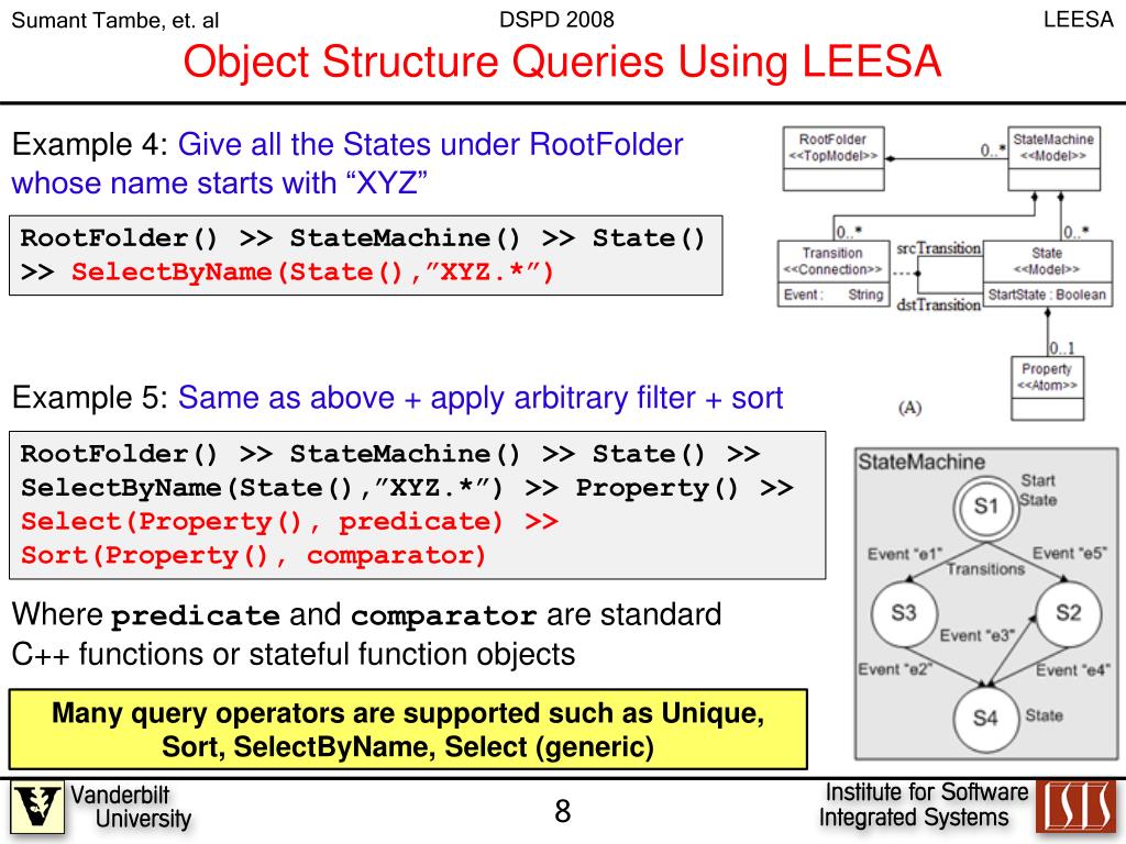 Object Structure Queries Using LEESA Example 4:Give all the States under RootFolder whose name starts with “XYZ” RootFolder() >> StateMachine() >> State() >> SelectByName(State(),”XYZ.*”) Example 5:Same as above + apply arbitrary filter + sort RootFolder() >> StateMachine() >> State() >> SelectByName(State(),”XYZ.*”) >> Property() >> Select(Property(), predicate) >> Sort(Property(), comparator) Where predicate and comparator are standardC++ functions or stateful function objects Many query operators are supported such as Unique, Sort, SelectByName, Select (generic)
