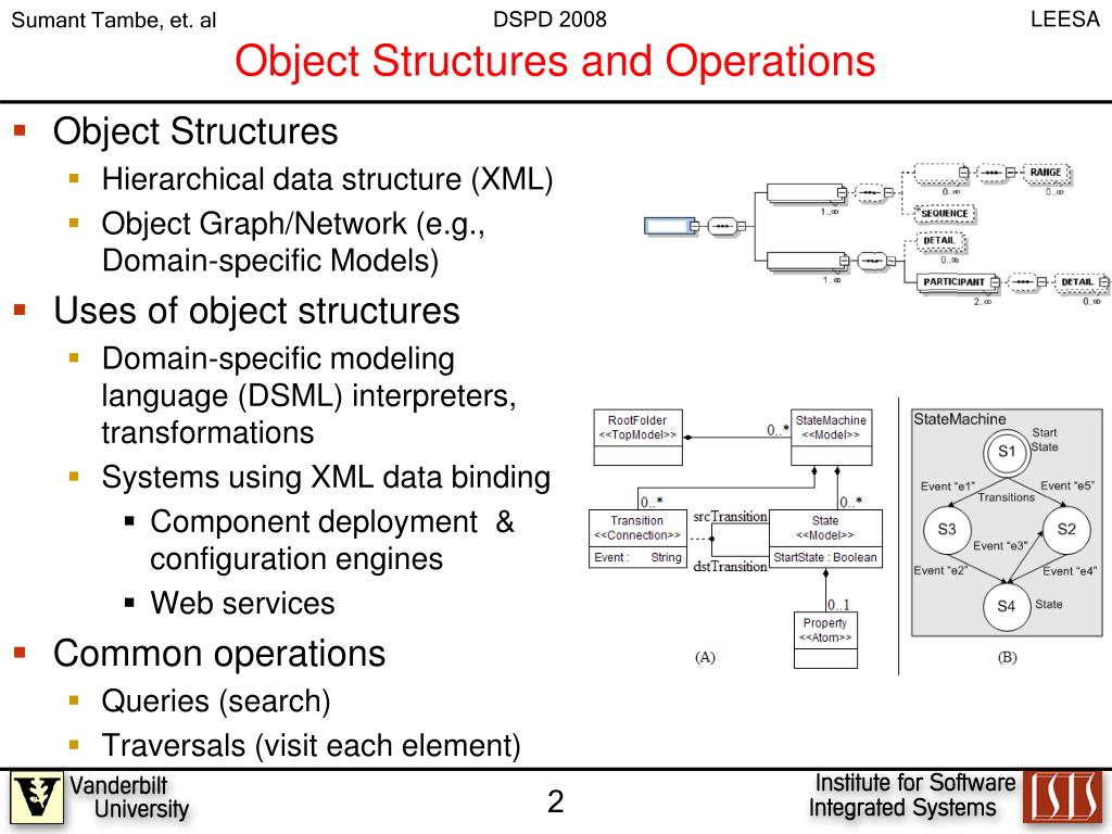 SumantTambe* AniruddhaGokhale Vanderbilt University, Nashville, TN, USA *Contact : sutambe@dre.vanderbilt.edu An Embedded Declarative Language for Hierarchical Object Structure Traversal 2nd International Workshop on Domain-Specific Program Development (DSPD), GPCE 2008, Nashville, TN, USA