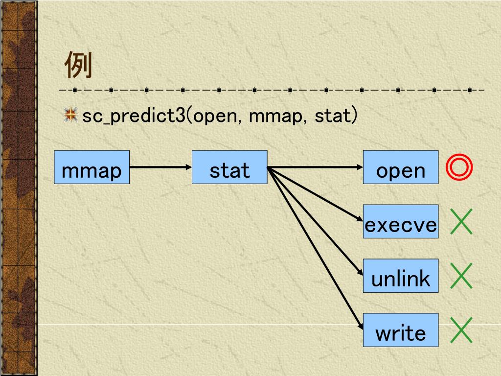 例 • sc_predict3(open, mmap, stat) mmap stat open execve unlink write