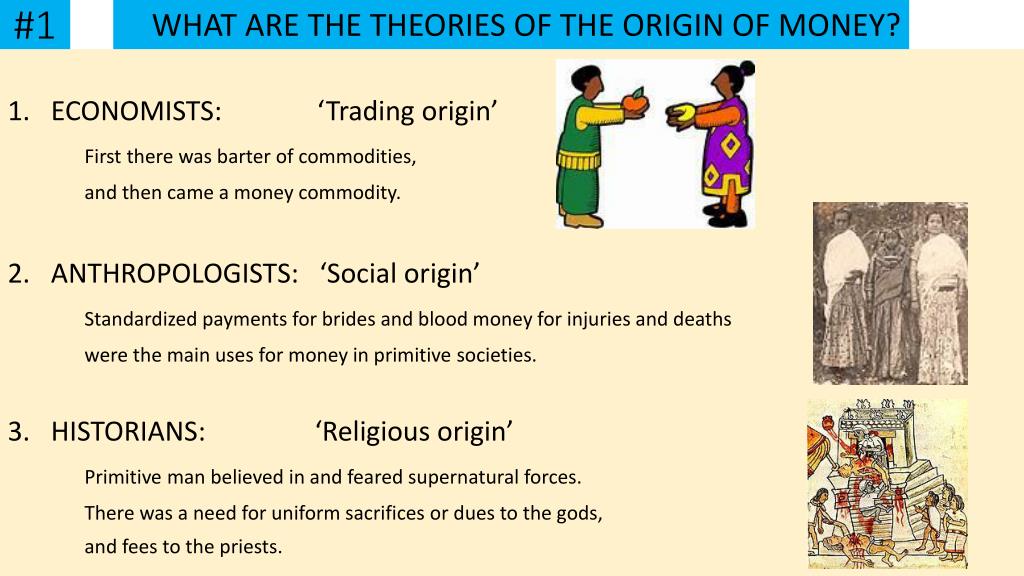 WHAT ARE THE THEORIES OF THE ORIGIN OF MONEY? ECONOMISTS: ‘Trading origin’ #1 The dominant theory today: economic profession’s ORIGIN FROM BARTER in trade and markets. Economists have no evidence for this theory. Their textbooks say…”imagine a barter economy”