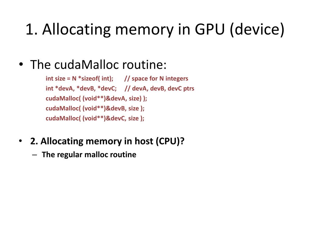 1. Allocating memory in GPU (device) • The cudaMalloc routine: int size = N *sizeof( int); // space for N integers int *devA, *devB, *devC; // devA, devB, devCptrs cudaMalloc( (void**)&devA, size) ); cudaMalloc( (void**)&devB, size ); cudaMalloc( (void**)&devC, size ); • 2. Allocating memory in host (CPU)? • The regular malloc routine
