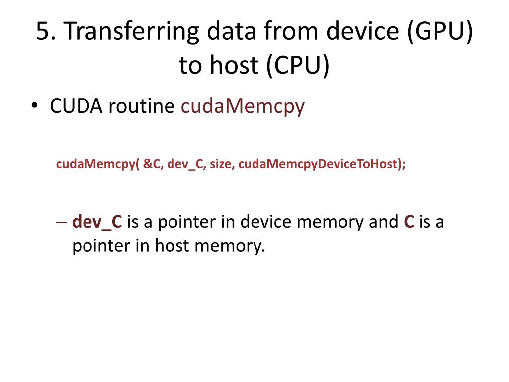 5. Transferring data from device (GPU) to host (CPU) • CUDA routine cudaMemcpy cudaMemcpy( &C, dev_C, size, cudaMemcpyDeviceToHost); • dev_Cis a pointer in device memory and C is a pointer in host memory.