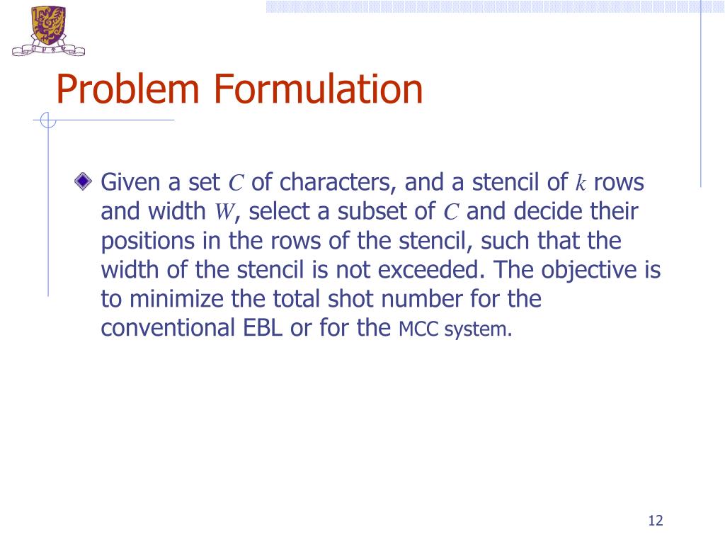 Problem Formulation • Given a set C of characters, and a stencil of k rows and width W, select a subset of C and decide their positions in the rows of the stencil, such that the width of the stencil is not exceeded. The objective is to minimize the total shot number for the conventional EBL or for the MCC system.