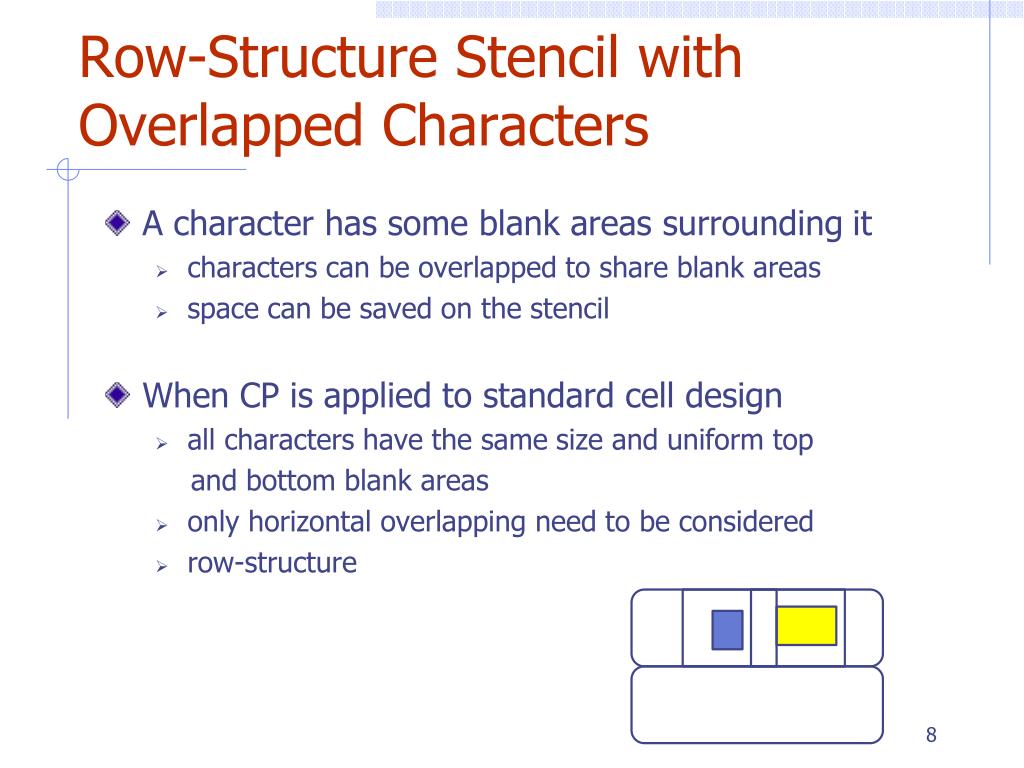 Row-Structure Stencil with Overlapped Characters • A character has some blank areas surrounding it • characters can be overlapped to share blank areas • space can be saved on the stencil • When CP is applied to standard cell design • all characters have the same size and uniform top and bottom blank areas • only horizontal overlapping need to be considered • row-structure