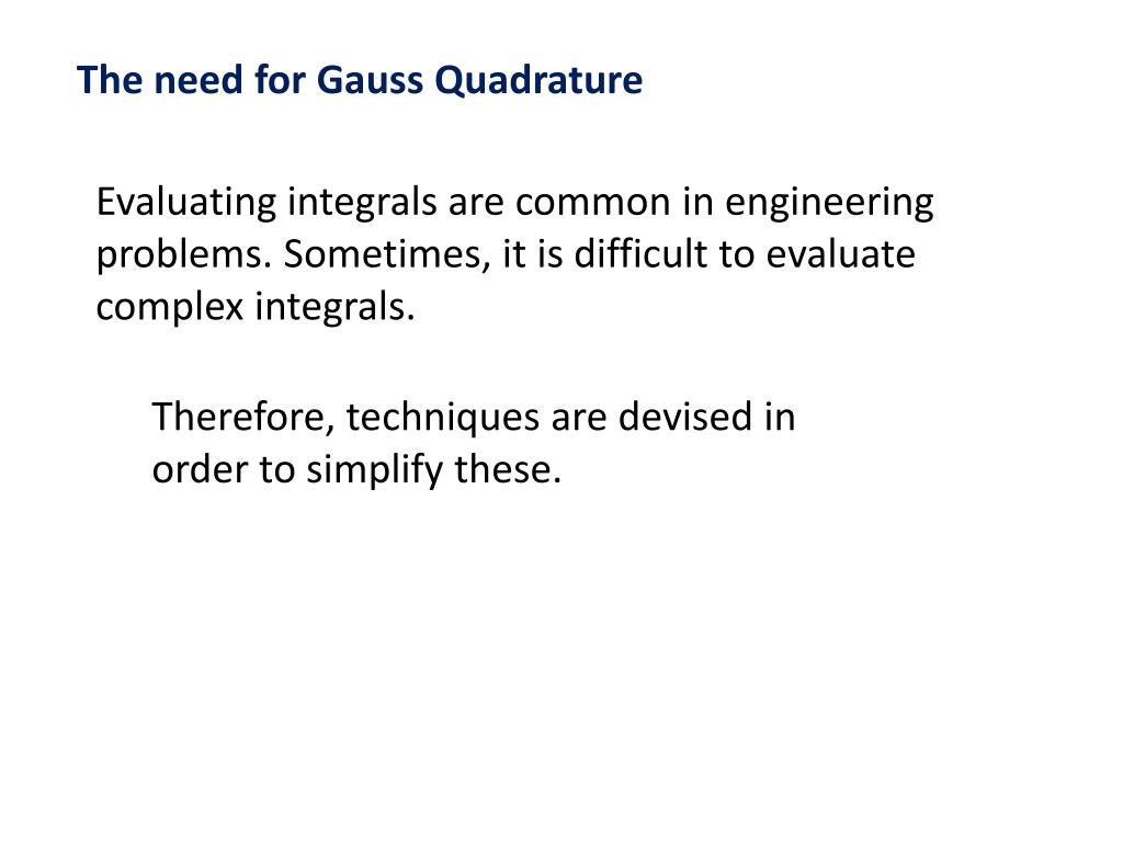 The need for Gauss Quadrature Evaluating integrals are common in engineering problems. Sometimes, it is difficult to evaluate complex integrals. Therefore, techniques are devised in order to simplify these.