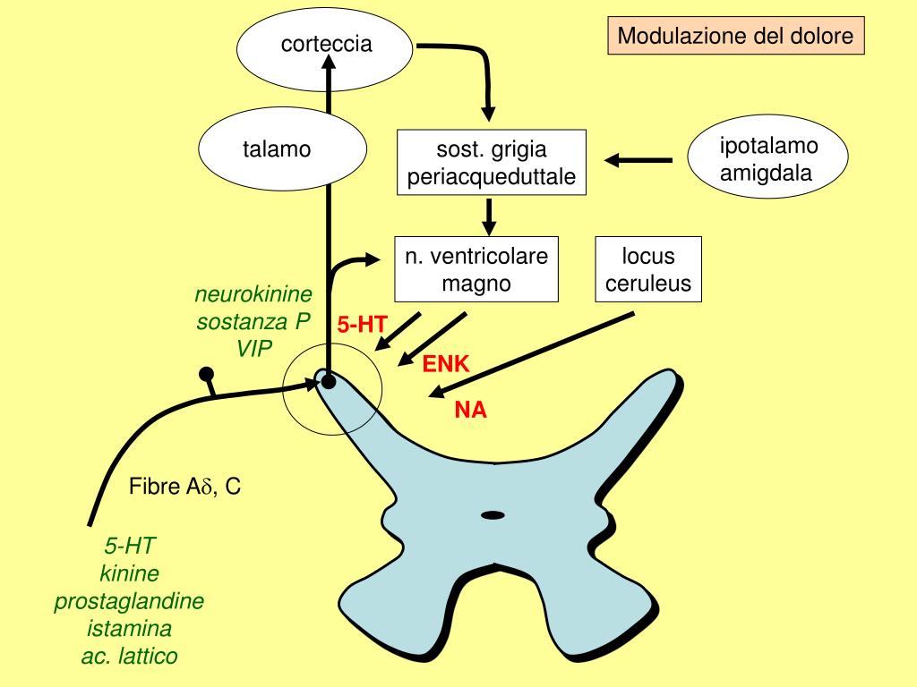 Modulazione del dolore corteccia ipotalamo amigdala talamo sost. grigia periacqueduttale n. ventricolare magno locus ceruleus neurokinine sostanza P VIP 5-HT ENK NA Fibre A, C 5-HT kinine prostaglandine istamina ac. lattico