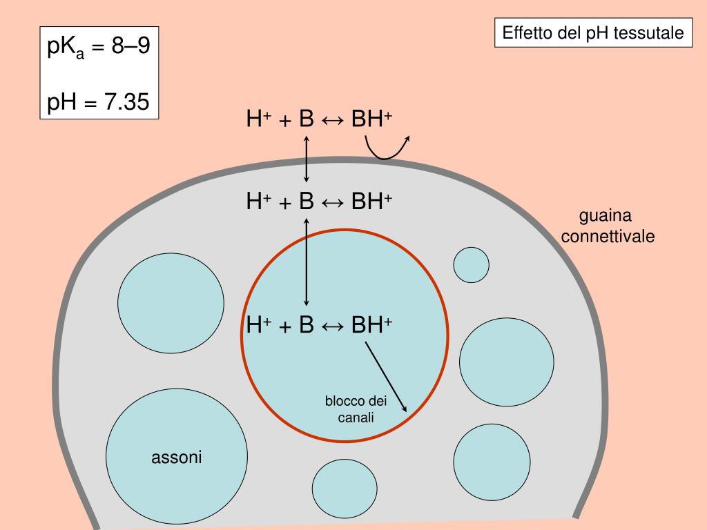 H+ + B ↔ BH+ guaina connettivale H+ + B ↔ BH+ H+ + B ↔ BH+ assoni blocco dei canali Effetto del pH tessutale pKa = 8–9 pH = 7.35