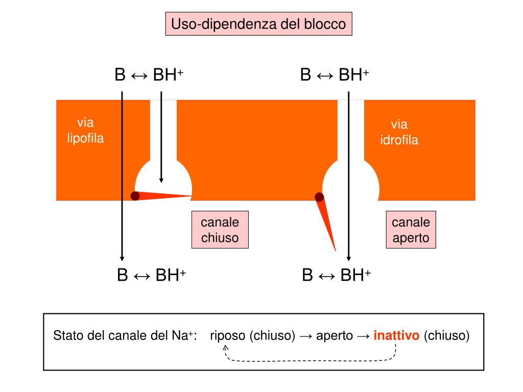 B ↔ BH+ B ↔ BH+ B ↔ BH+ B ↔ BH+ Stato del canale del Na+: riposo (chiuso) → aperto → inattivo (chiuso) Uso-dipendenza del blocco via lipofila via idrofila canale chiuso canale aperto