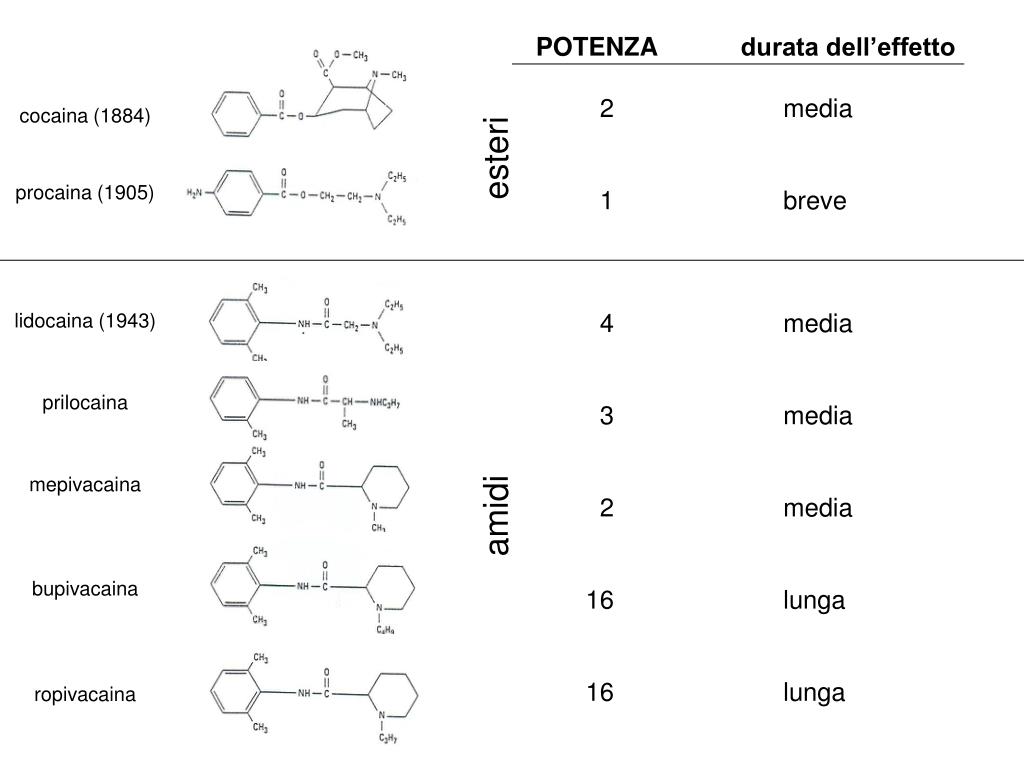 POTENZA durata dell’effetto 2 media 1 breve 4 media 3 media 2 media 16 lunga 16 lunga cocaina (1884) esteri procaina (1905) lidocaina (1943) prilocaina mepivacaina amidi bupivacaina ropivacaina