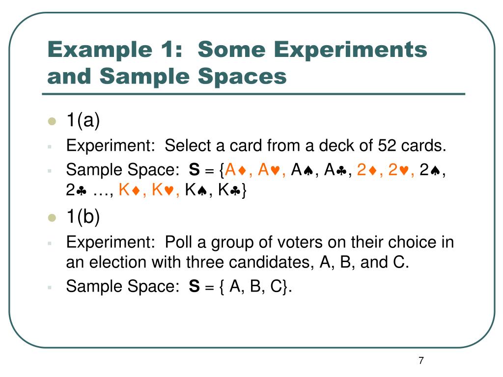 Example 1: Some Experiments and Sample Spaces • 1(a) • Experiment: Select a card from a deck of 52 cards. • Sample Space: S = {A, A, A, A, 2, 2, 2, 2 …, K, K, K, K} • 1(b) • Experiment: Poll a group of voters on their choice in an election with three candidates, A, B, and C. • Sample Space: S = { A, B, C}.