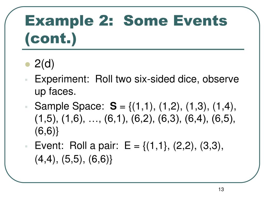 Example 2: Some Events (cont.) • 2(d) • Experiment: Roll two six-sided dice, observe up faces. • Sample Space: S = {(1,1), (1,2), (1,3), (1,4), (1,5), (1,6), …, (6,1), (6,2), (6,3), (6,4), (6,5), (6,6)} • Event: Roll a pair: E = {(1,1}, (2,2), (3,3), (4,4), (5,5), (6,6)}