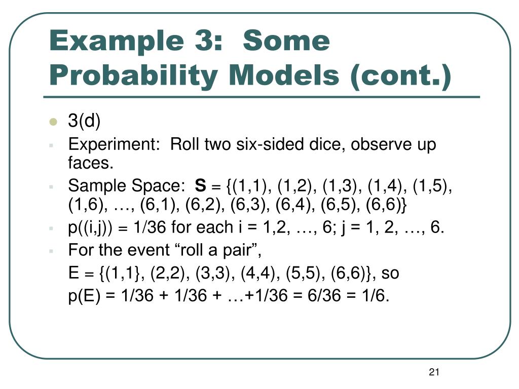 Example 3: Some Probability Models (cont.) • 3(d) • Experiment: Roll two six-sided dice, observe up faces. • Sample Space: S = {(1,1), (1,2), (1,3), (1,4), (1,5), (1,6), …, (6,1), (6,2), (6,3), (6,4), (6,5), (6,6)} • p((i,j)) = 1/36 for each i = 1,2, …, 6; j = 1, 2, …, 6. • For the event “roll a pair”, • E = {(1,1}, (2,2), (3,3), (4,4), (5,5), (6,6)}, so • p(E) = 1/36 + 1/36 + …+1/36 = 6/36 = 1/6.