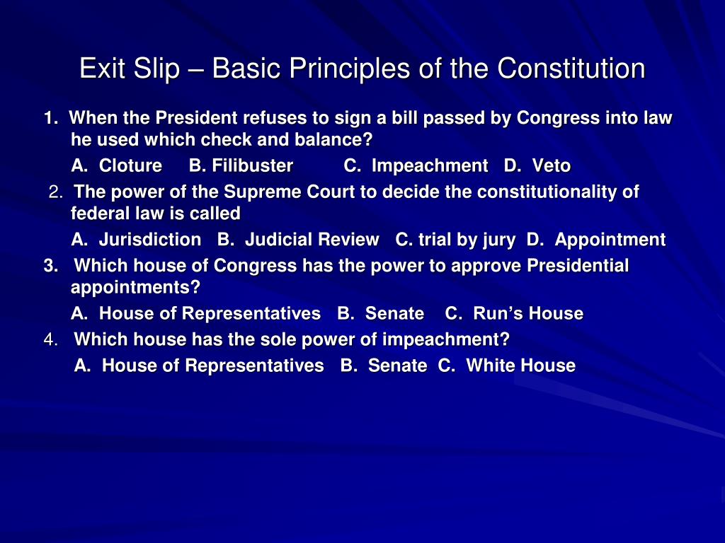 Exit Slip – Basic Principles of the Constitution 1. When the President refuses to sign a bill passed by Congress into law he used which check and balance? A. Cloture B. Filibuster C. Impeachment D. Veto 2. The power of the Supreme Court to decide the constitutionality of federal law is called A. Jurisdiction B. Judicial Review C. trial by jury D. Appointment 3. Which house of Congress has the power to approve Presidential appointments? A. House of Representatives B. Senate C. Run’s House 4. Which house has the sole power of impeachment? A. House of Representatives B. Senate C. White House