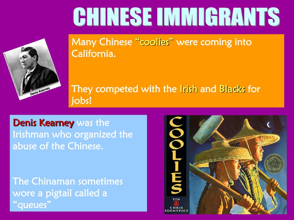CHINESE IMMIGRANTS Many Chinese “coolies” were coming into California. They competed with the Irish and Blacks for jobs! Denis Kearney was the Irishman who organized the abuse of the Chinese. The Chinaman sometimes wore a pigtail called a “queues”