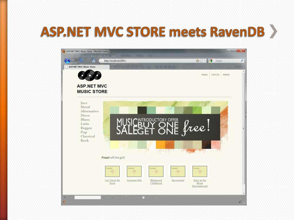 What does Raven DB have to offer? • Nice web interface allowing you to see, manipulate and query your documents. • Is REST based, so you can access it via the java script API directly. • Can be extended by writing MEF plugins. • Has trigger support that allow you to do some really nifty things, like document merges, auditing, versioning and authorization. • Supports partial document updates, so you don’t have to send full documents over the wire. • Supports sharding out of the box. • Is available in both OSS and commercial modes. http://ayende.com/Blog/archive/2010/05/13/why-raven-db.aspx