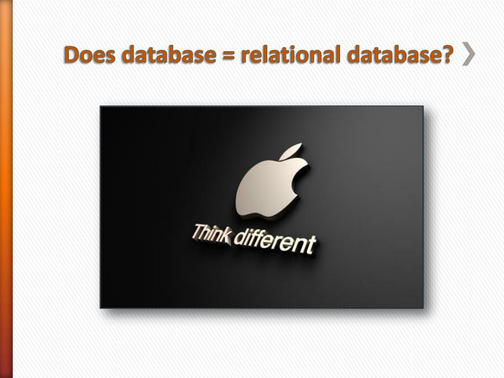 What is a database? • When most people say database, they mean relational database. • Why would we need to broaden our definition of a database? • What industry trends are challenging this venerable technology?