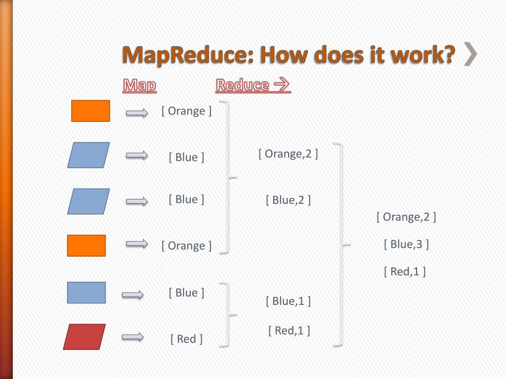MapReduce: How does it work? Map Reduce [ Orange ] [ Orange,2 ] [ Blue ] [ Blue ] [ Blue,2 ] [ Orange,2 ] [ Blue,3 ] [ Orange ] [ Red,1 ] [ Blue ] [ Blue,1 ] [ Red,1 ] [ Red ]