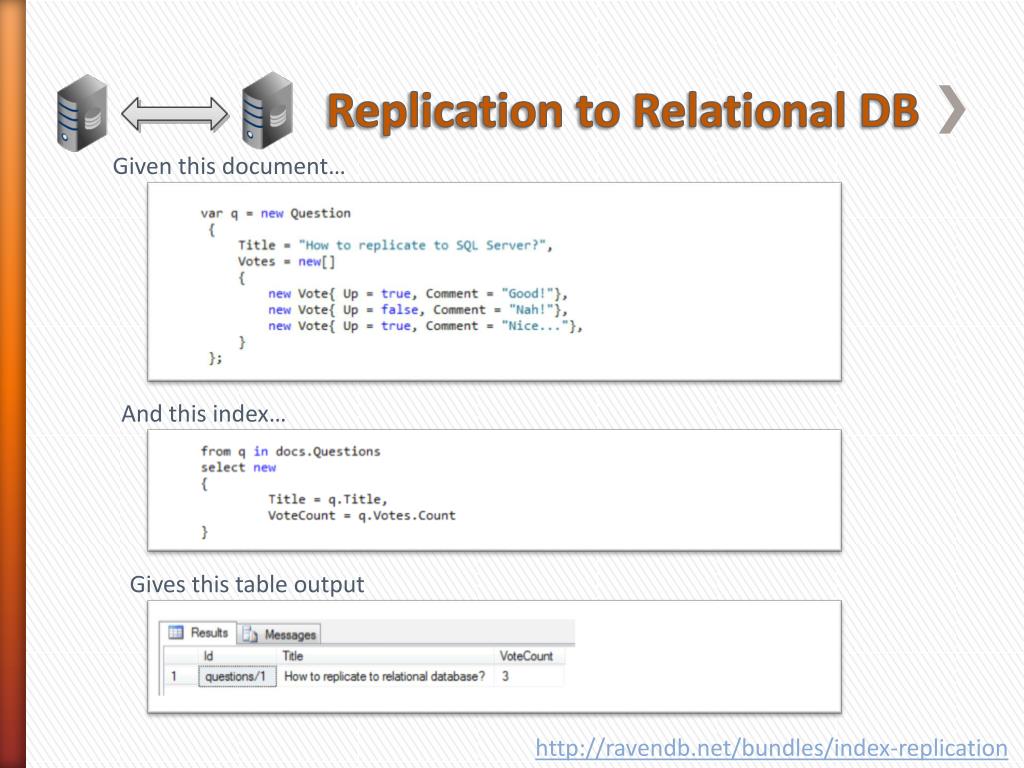 Replication to Relational DB Given this document… And this index… Gives this table output http://ravendb.net/bundles/index-replication