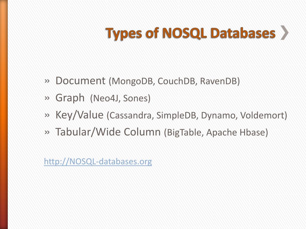 Types of NOSQL Databases • Document (MongoDB, CouchDB, RavenDB) • Graph (Neo4J, Sones) • Key/Value (Cassandra, SimpleDB, Dynamo, Voldemort) • Tabular/Wide Column (BigTable, Apache Hbase) http://NOSQL-databases.org