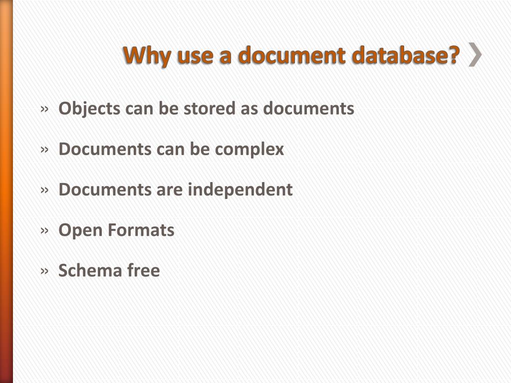 Why use a document database? • Objects can be stored as documents • Documents can be complex • Documents are independent • Open Formats • Schema free
