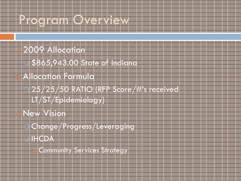 Program Overview • 2009 Allocation • $865,943.00 State of Indiana • Allocation Formula • 25/25/50 RATIO (RFP Score/#’s received LT/ST/Epidemiology) • New Vision • Change/Progress/Leveraging • IHCDA • Community Services Strategy